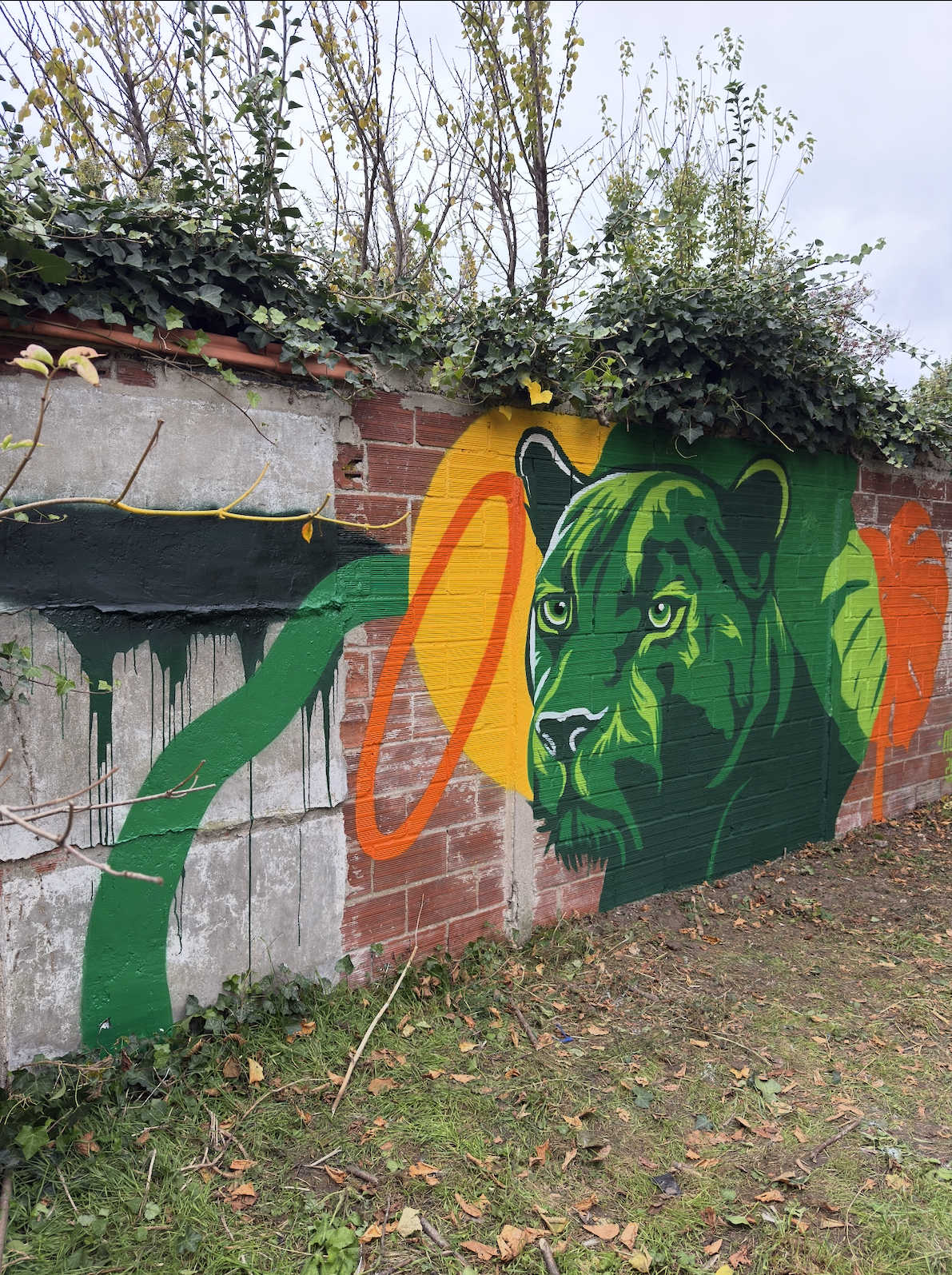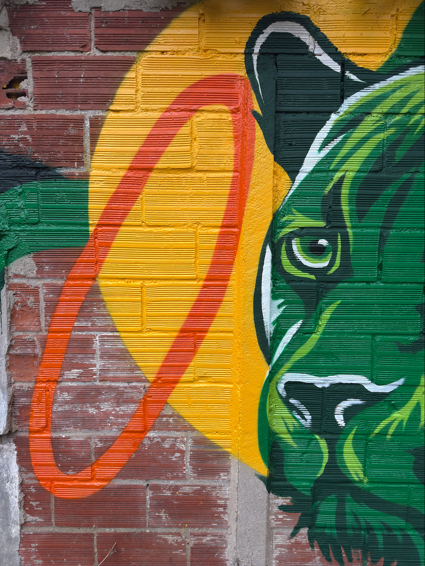 J'ai donc décidé de garder cet aspect brique et de ne pas peindre sur toute la surface on y retrouve une panthère un soleil et une monstera deliciosa.